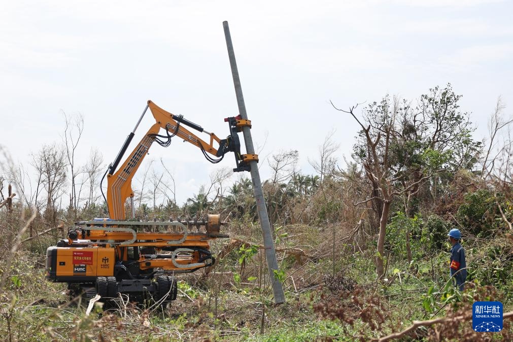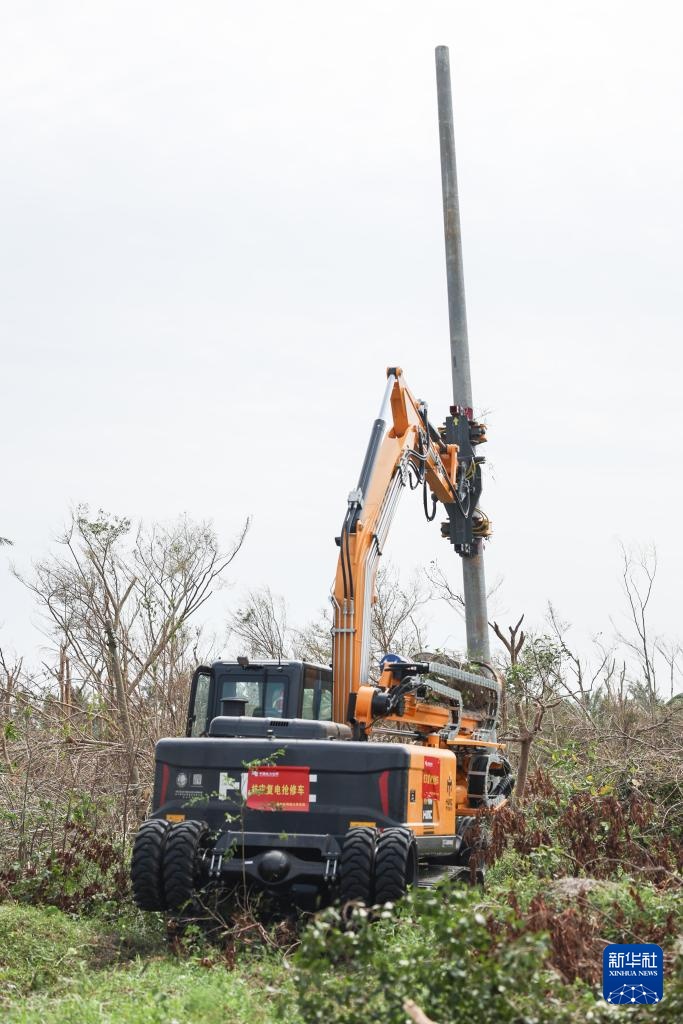 受台风“摩羯”影响,海南文昌多地出现电线杆倒伏的情况。为了加快抢修进度,南方电网调配配网钻孔立杆一体机参与抢修,提升作业效率。