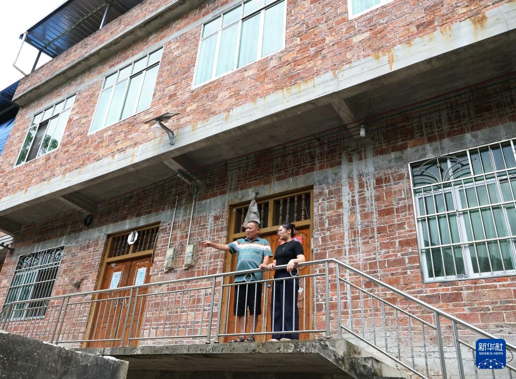 在环江毛南族自治县下南乡中南村上义屯,谭献祯(右)和父亲谭惠华回到曾经住的老房子(8月29日摄)。