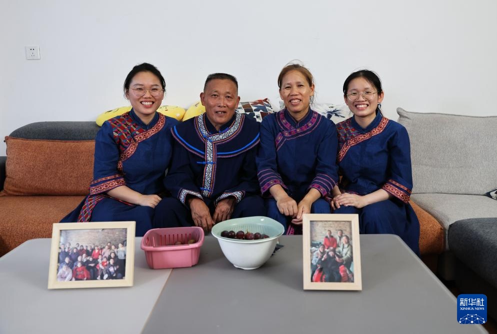 在环江毛南族自治县毛南家园城西安置区,谭献祯(左一)一家四口在家中拍摄全家福照片(8月28日摄)。