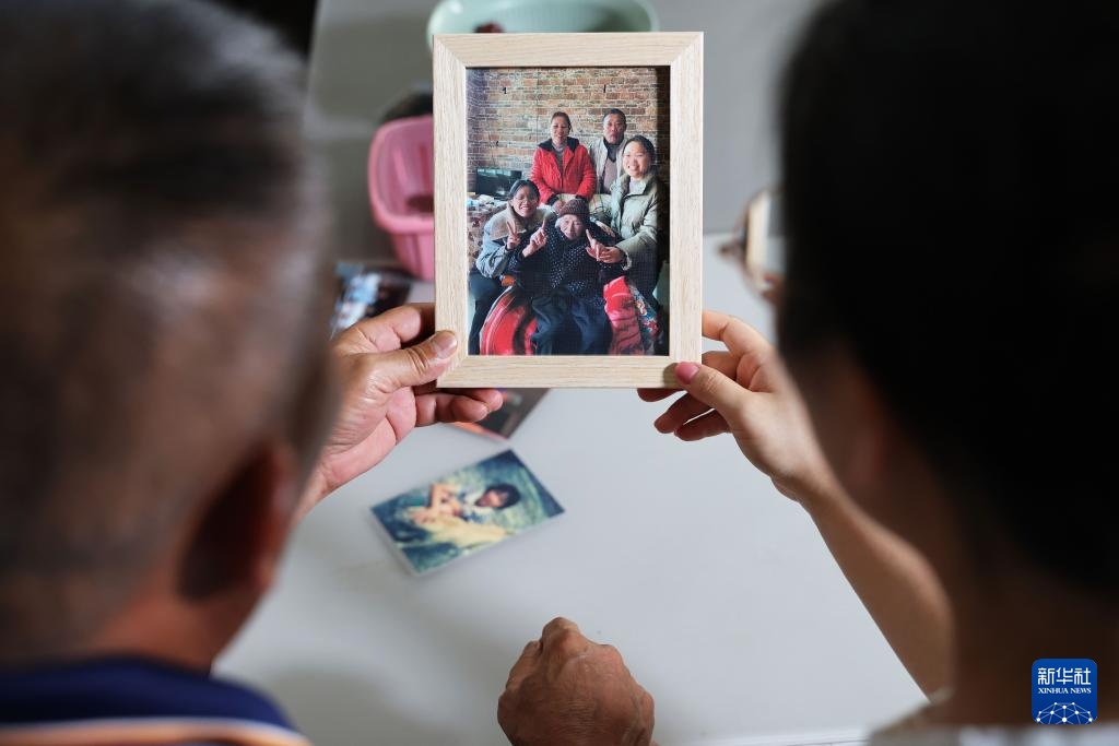 在环江毛南族自治县毛南家园城西安置区的家中,谭献祯(右)和父亲谭惠华一起查看老照片(8月28日摄)。老照片拍摄于谭献祯在上义屯的老家。
