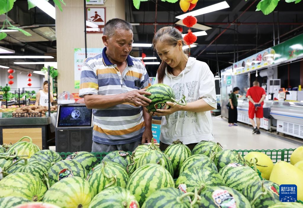 在环江毛南族自治县毛南家园城西安置区,谭献祯的父亲谭惠华(左一)和母亲谭怀柳在超市挑西瓜(8月28日摄)。