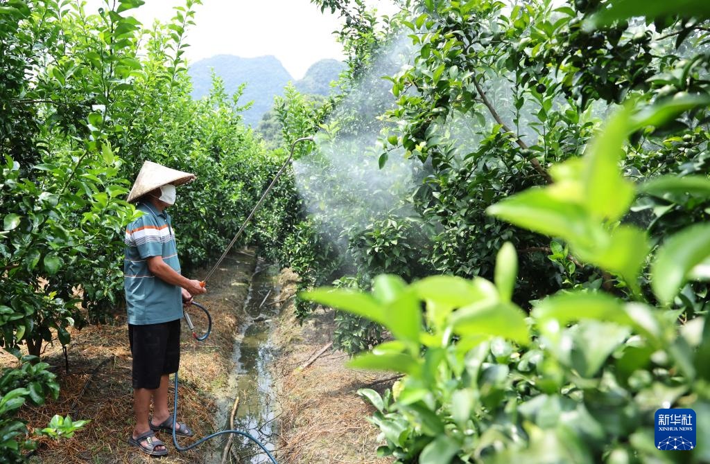 在环江毛南族自治县下南乡,谭献祯的父亲谭惠华为柑橘树打药(8月29日摄)。