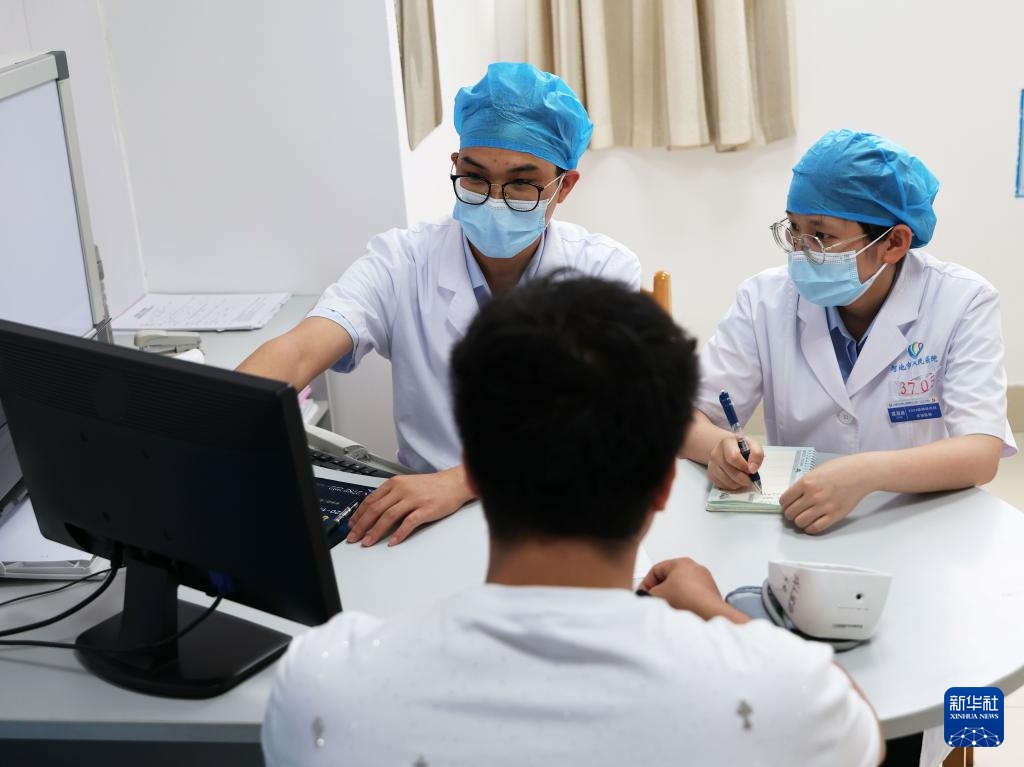 在河池市人民医院,谭献祯的妹妹谭淑祯(右)和医生出门诊(8月28日摄)。