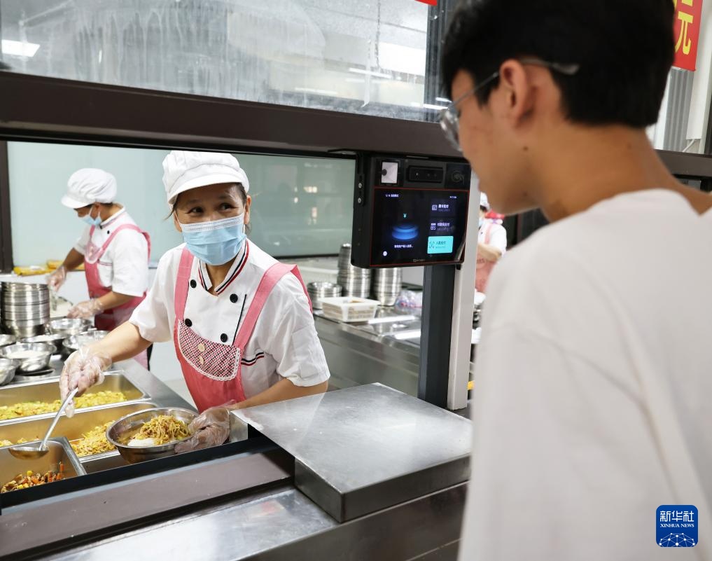 在环江毛南族自治县思源实验学校中学部食堂,谭献祯母亲谭怀柳(中)为学生打饭(8月28日摄)。