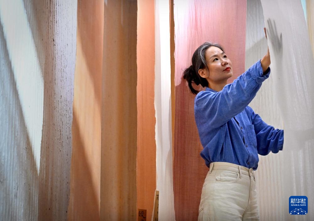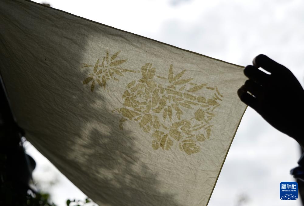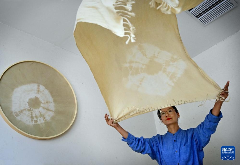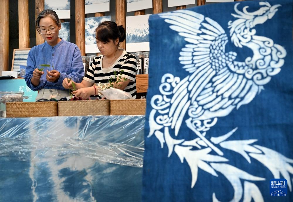 王丹凤在位于洛阳栾川的非遗研学基地内将染好的布料进行晾晒(9月13日摄)。