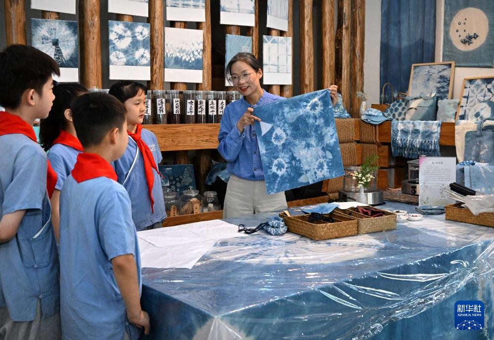 王丹凤在位于洛阳栾川的非遗研学基地内向小学生介绍粗布印染技艺(9月13日摄)。