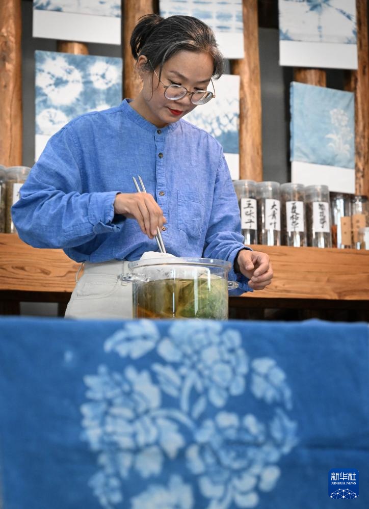 王丹凤在位于洛阳栾川的非遗研学基地内进行粗布印染(9月13日摄)。