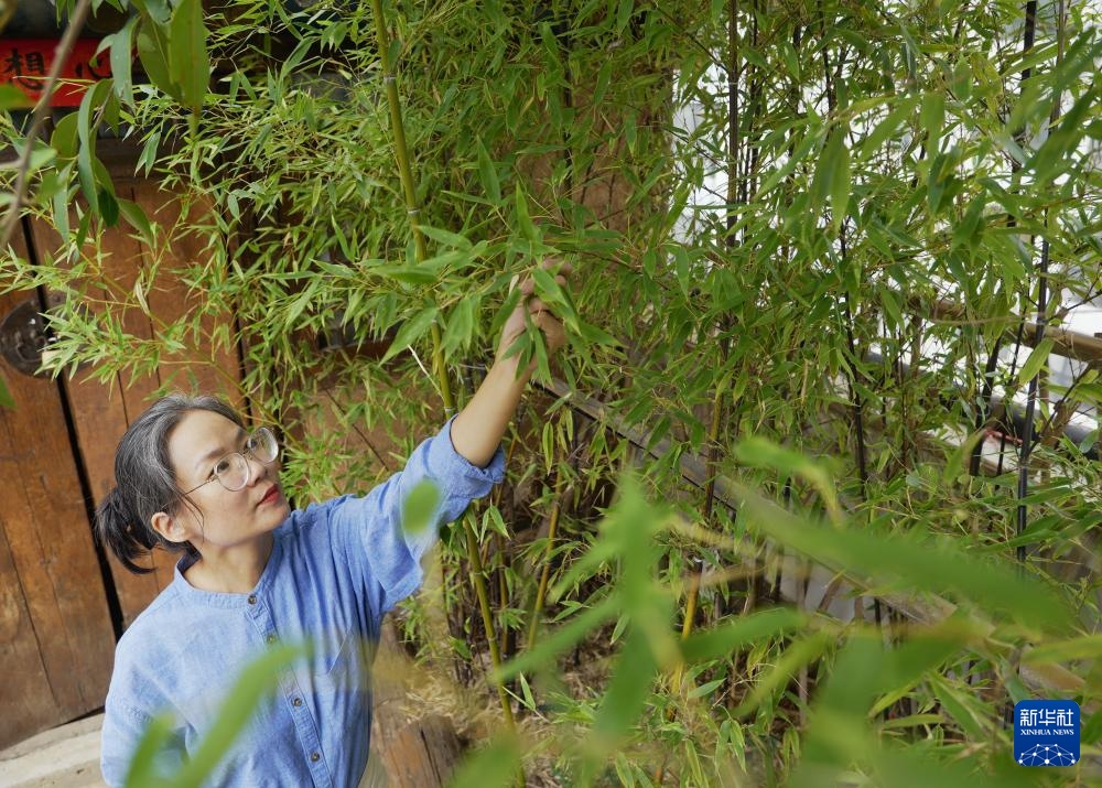 王丹凤在采摘用于粗布印染的竹叶(9月13日摄) 。