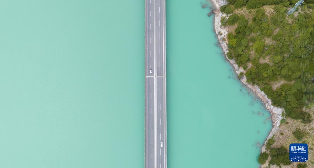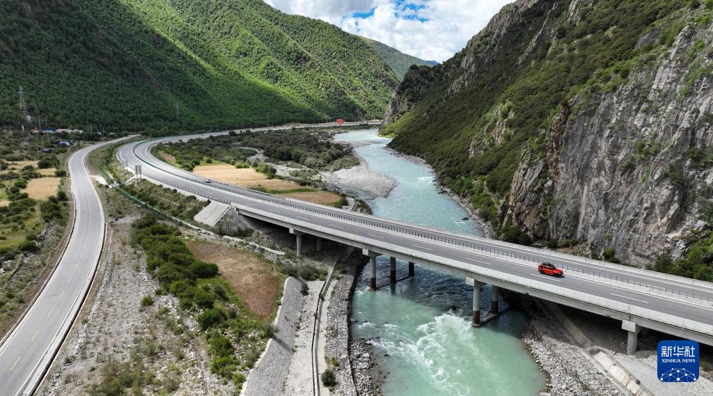9月5日拍摄的横跨在西藏林芝市境内尼洋河上的林芝至拉萨高等级(高速)公路(无人机照片)。