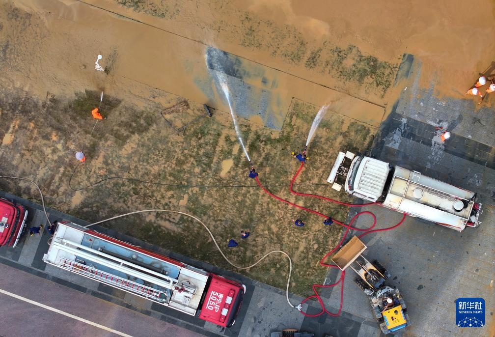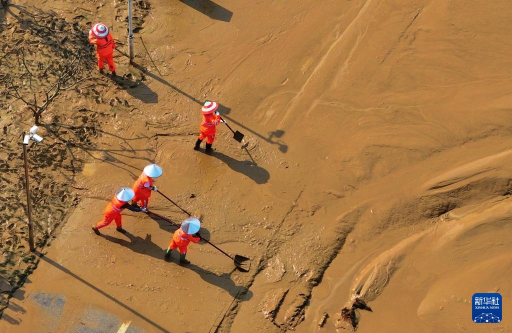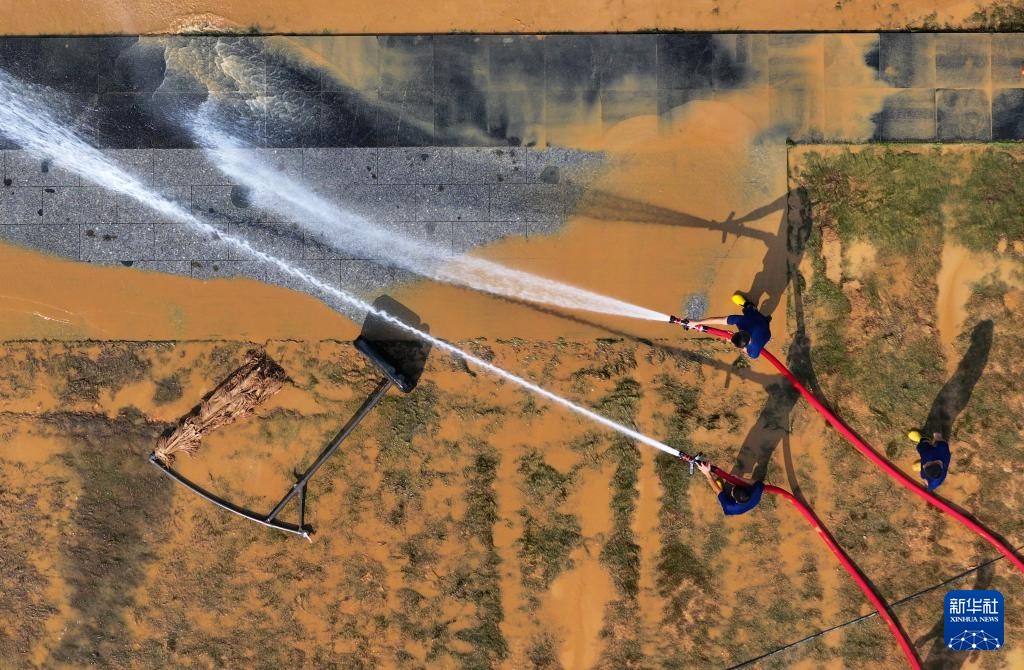 当日,广西南宁市邕江水位退至73米的警戒水位以下,当地相关部门组织人员对邕江两岸的公园、道路、景观等,进行清淤作业。