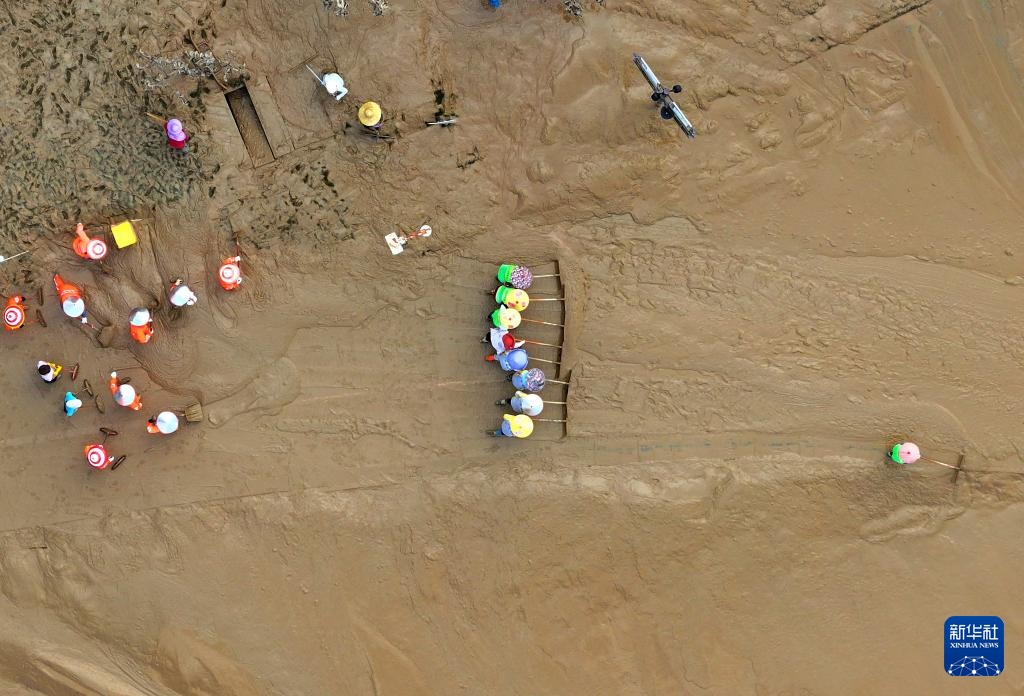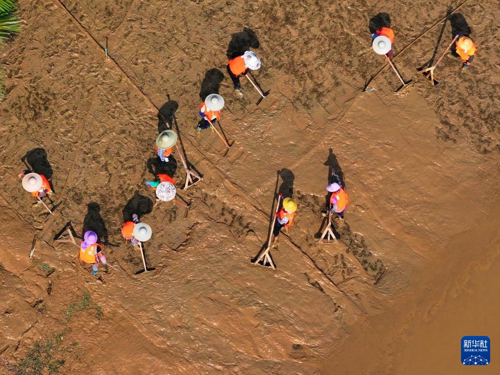 9月15日,工作人员在南宁市邕江边清理淤泥(无人机照片)。