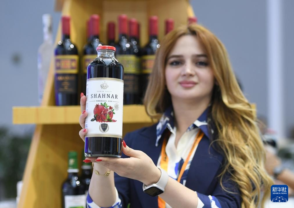9月15日,在服贸会国家会议中心展区,阿塞拜疆展台的参展商介绍一款石榴汁。
