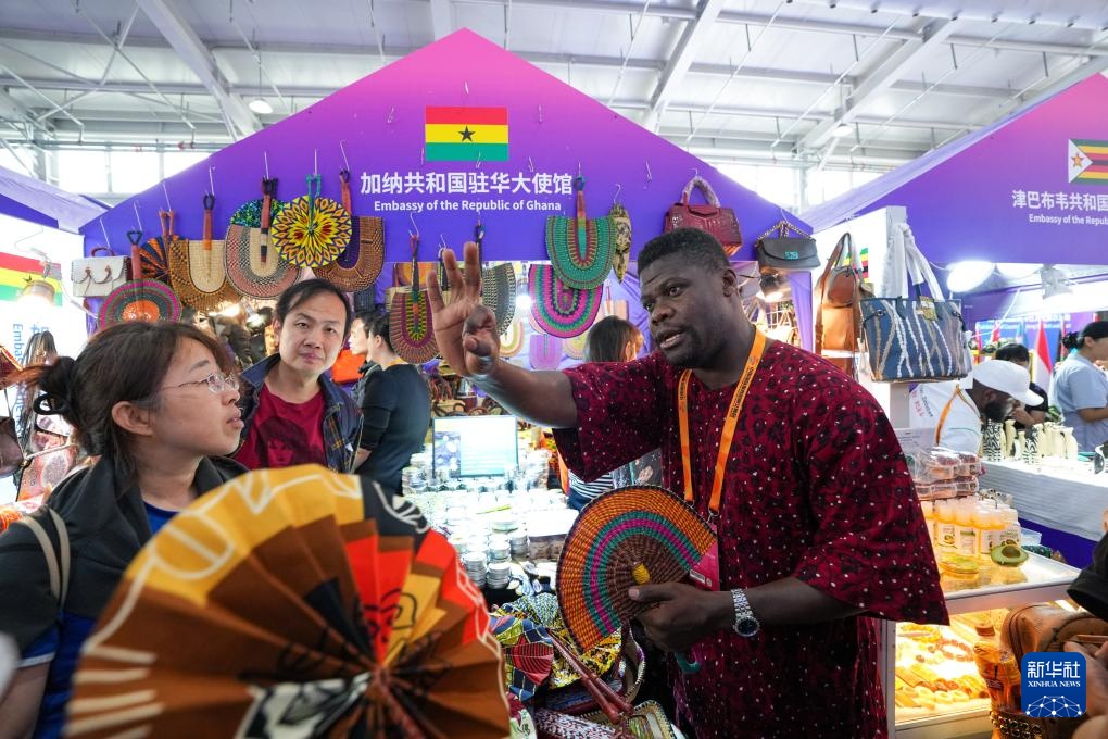 9月15日,在服贸会首钢园区的加纳共和国驻华大使馆展区,一位工作人员在介绍展出的商品。
