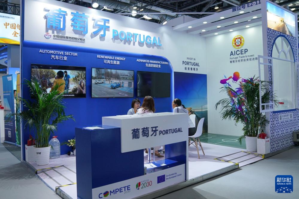 9月15日,在服贸会国家会议中心展区,参展嘉宾在葡萄牙展台内交流。