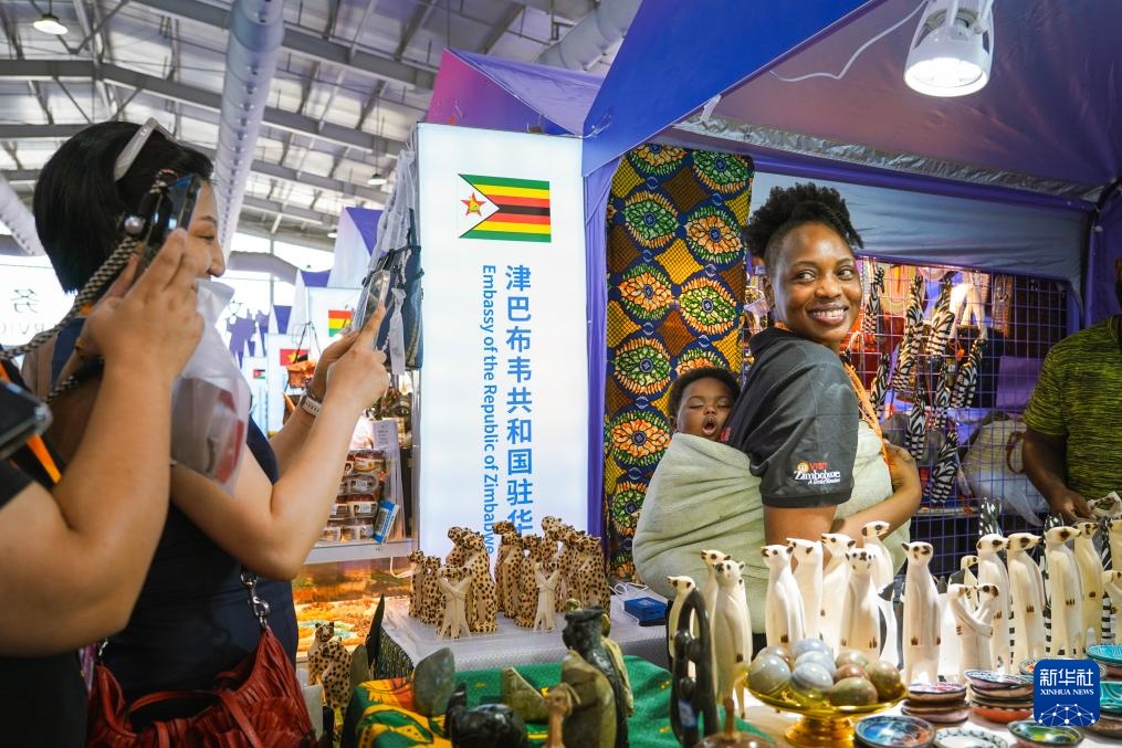 9月14日,在服贸会首钢园区,工作人员在津巴布韦共和国驻华大使馆展区与参观者互动交流。