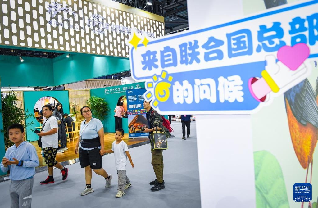 9月15日,位于服贸会国家会议中心展区的联合国邮政管理局、国际竹藤组织等展位吸引参观者的目光。