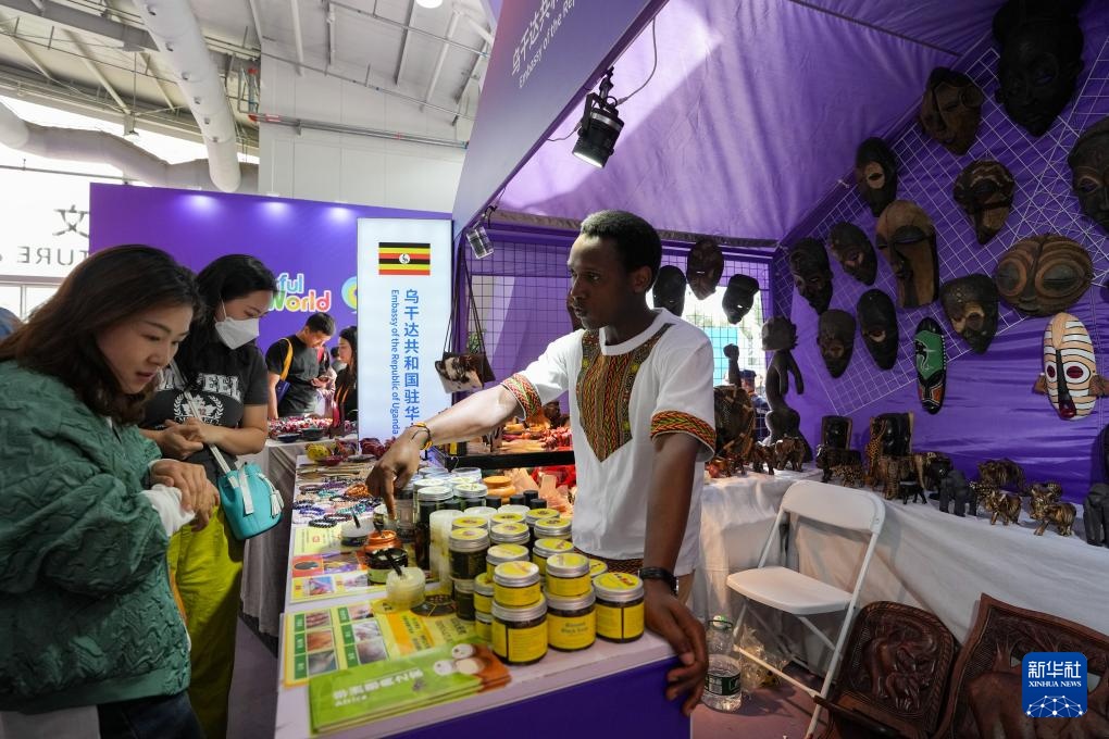 9月15日,在服贸会首钢园区的乌干达共和国驻华大使馆展区,一位工作人员在介绍展出的商品。