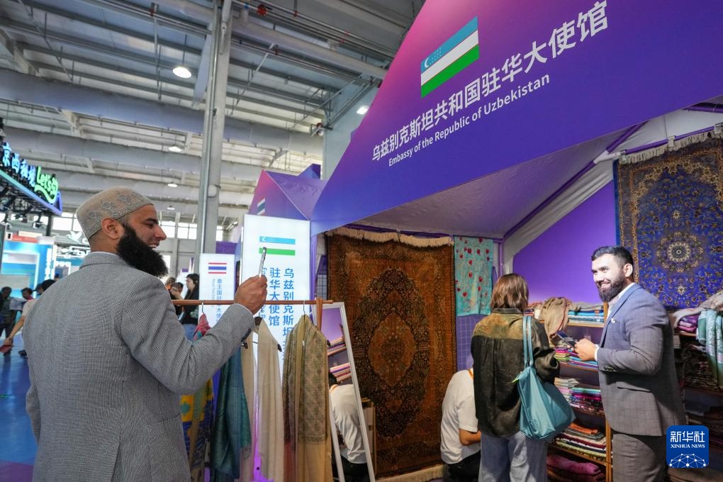 9月15日,在服贸会首钢园区,来自巴基斯坦的展商(左一)在乌兹别克斯坦共和国驻华大使馆展区参观。
