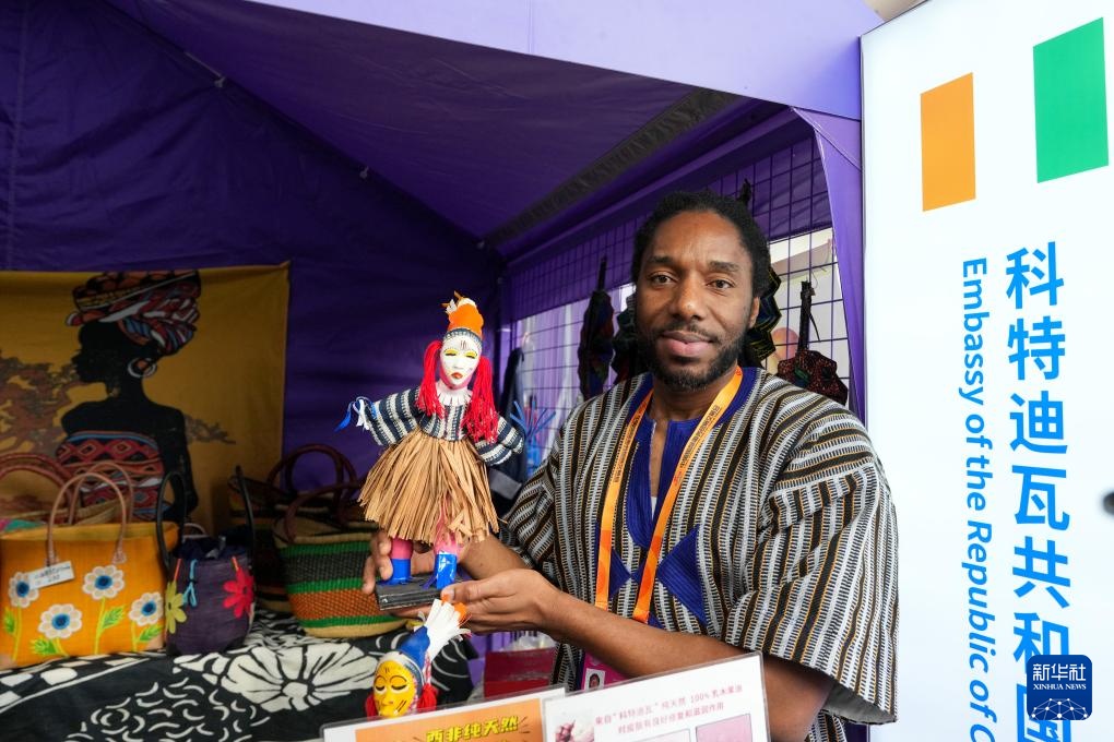 9月15日,在服贸会首钢园区的科特迪瓦共和国驻华大使馆展区,一位工作人员在展示特色工艺品。