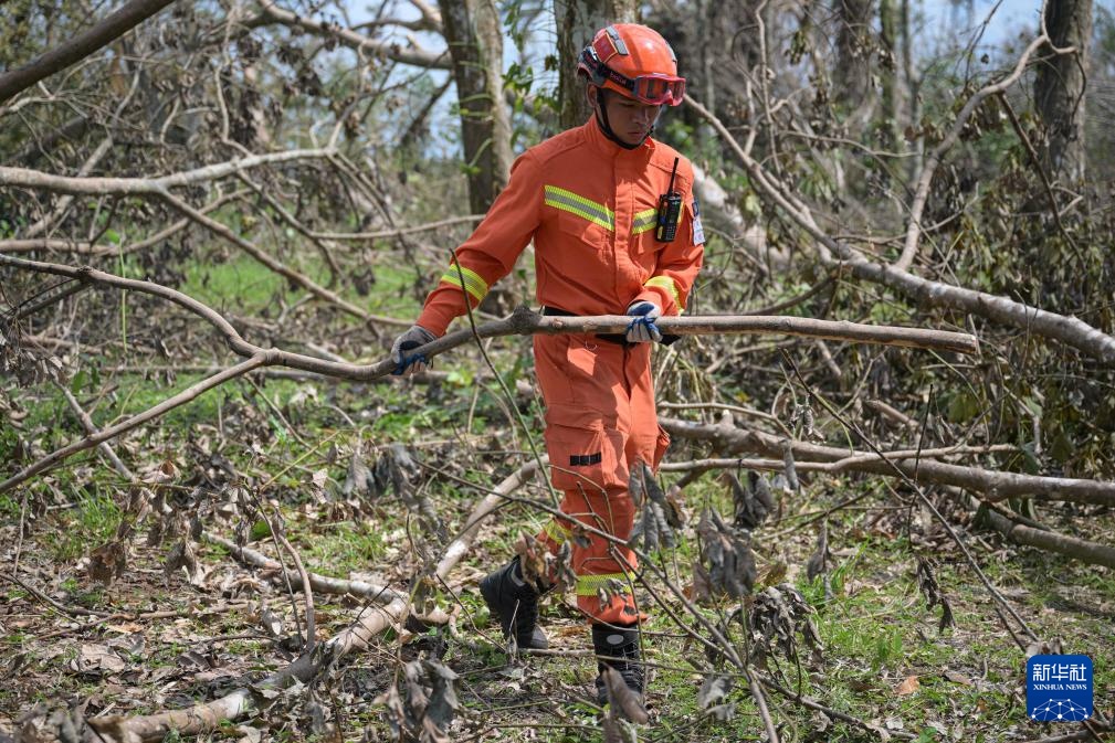 9月14日,在位于海南省海口市的海南热带野生动植物园,国家消防救援局海南机动队伍的救援人员进行清障作业。