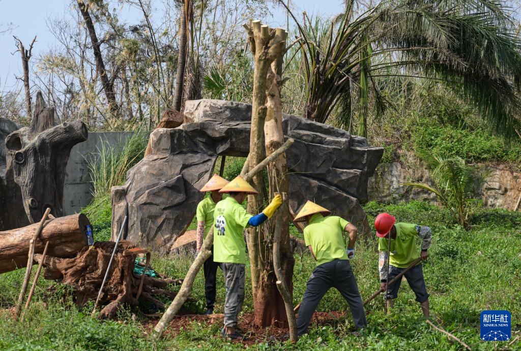 9月14日,在位于海南省海口市的海南热带野生动植物园,工作人员重新栽种倒伏的树木。