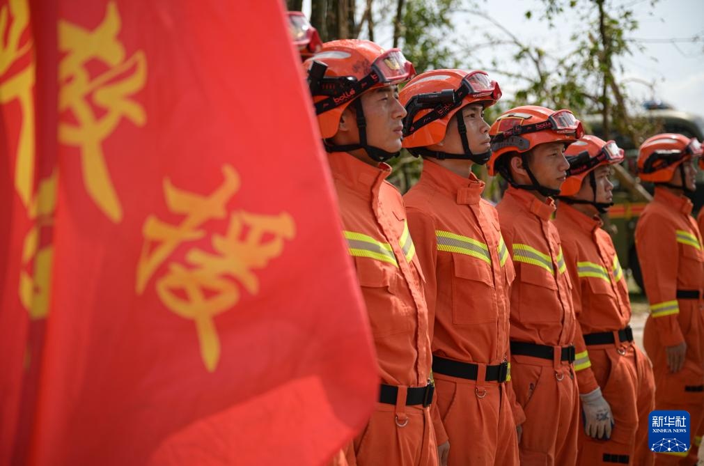 9月14日,在位于海南省海口市的海南热带野生动植物园,国家消防救援局海南机动队伍的救援人员在列队,准备开展灾后修复工作。