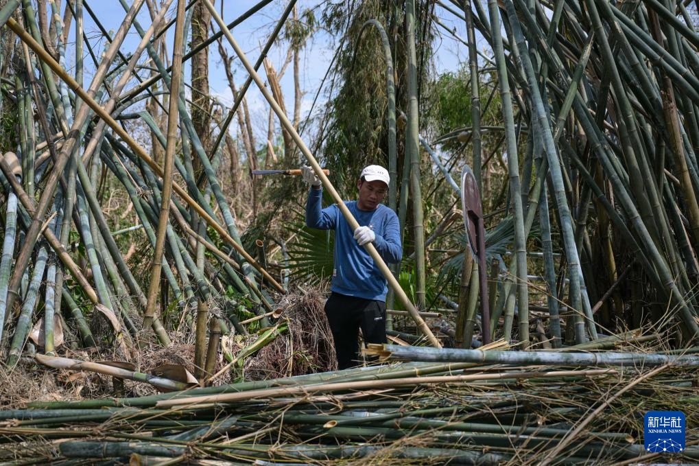 9月14日,在位于海南省海口市的海南热带野生动植物园,志愿者清理在台风中倒伏的竹子。