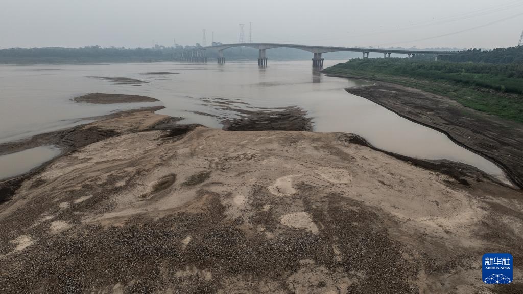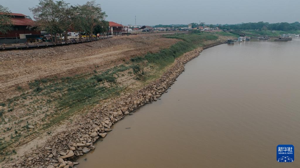 这是9月13日在巴西朗多尼亚州波多韦柳拍摄的马代拉河(无人机照片)。巴西地质调查局的数据显示,亚马孙河流域的马代拉河已经达到历史最低水位。