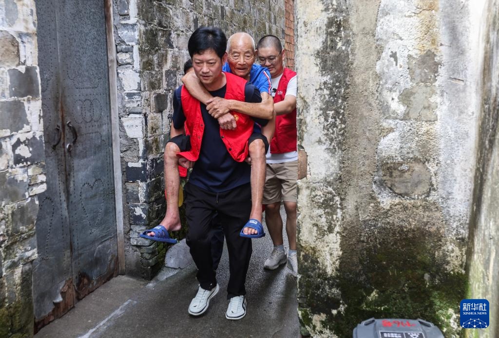 9月19日,浙江省诸暨市赵家镇泉畈村村干部和党员志愿者在台风来临前转移危旧房里的99岁老人何启林。