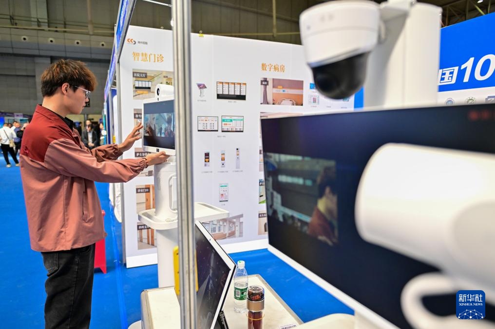 9月20日,在新疆国际会展中心举行的新疆数字丝路博览会现场,工作人员在调试移动查房机。