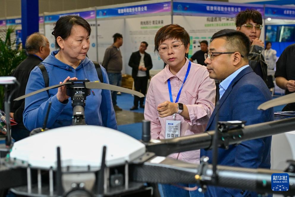 9月20日,在新疆国际会展中心举行的新疆数字丝路博览会现场,参观者在了解无人机产品。