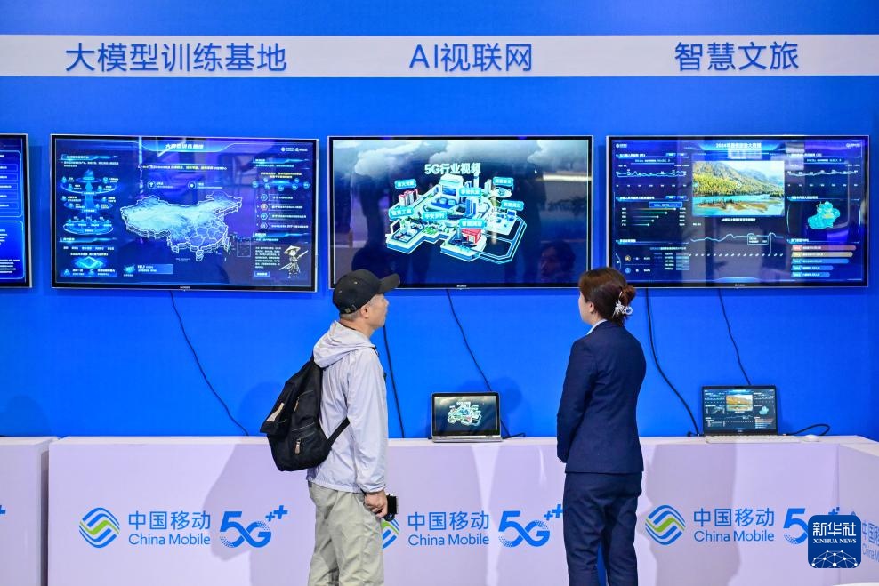 9月20日,在新疆国际会展中心举行的新疆数字丝路博览会现场,参观者在了解5G通信技术。