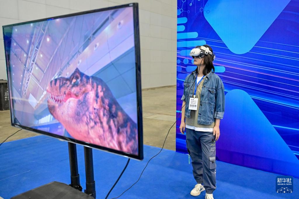9月20日,在新疆国际会展中心举行的新疆数字丝路博览会现场,参观者在体验MR设备。