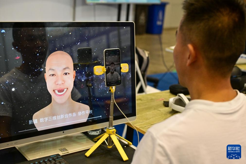 9月20日,在新疆国际会展中心举行的新疆数字丝路博览会现场,参观者在体验照片3D建模和动作捕捉技术。