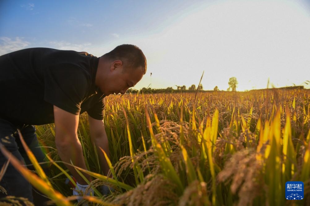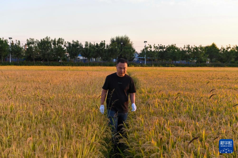 9月20日,在位于吉林省永吉县万昌镇的永吉县禾谷丰水稻种植农民专业合作社,负责人张帅在查看水稻生长情况。