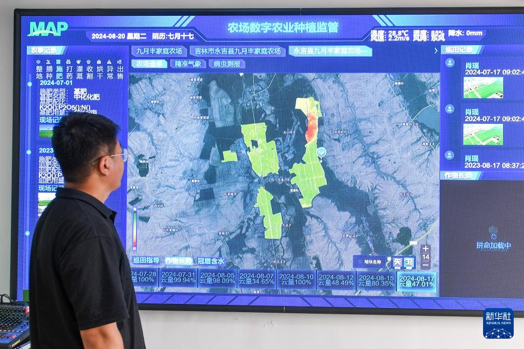8月20日,在位于吉林省永吉县一拉溪镇的九月丰家庭农场,负责人肖瑶在查看智慧农业可视化平台。