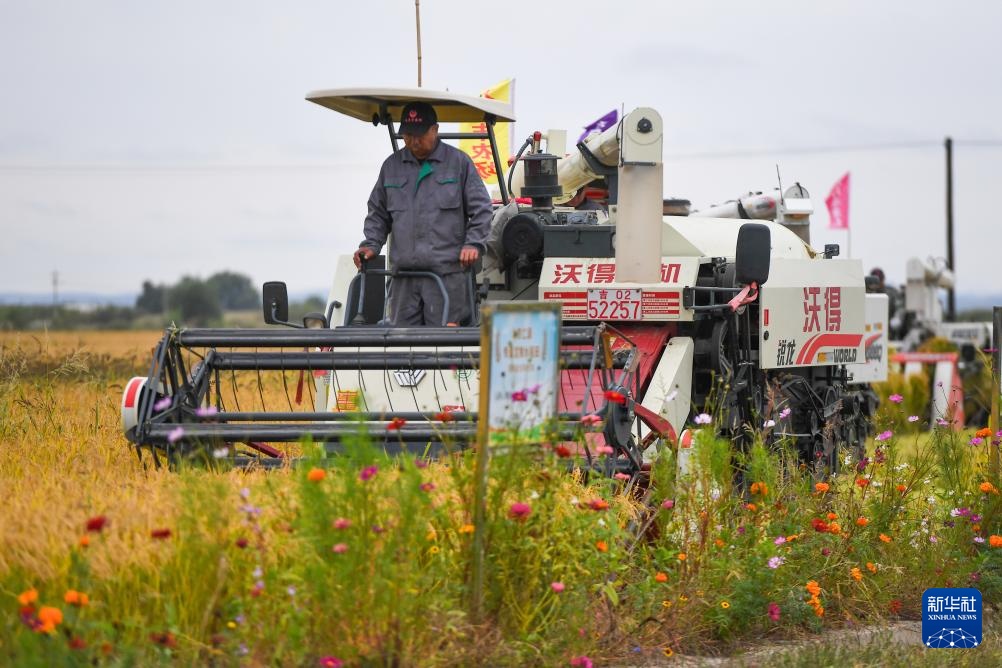 9月20日,在位于吉林省永吉县一拉溪镇的九月丰家庭农场金秋开镰仪式现场,农民驾驶农机进行水稻机械化收割展示。