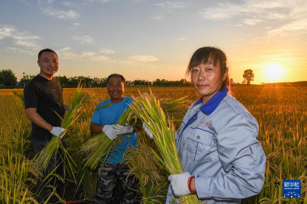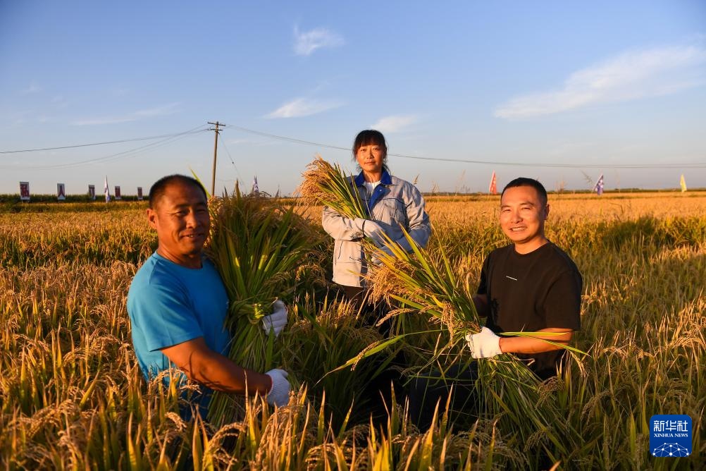 9月20日,在位于吉林省永吉县万昌镇的永吉县禾谷丰水稻种植农民专业合作社,负责人张帅(左一)和两位农民手捧收获的水稻。