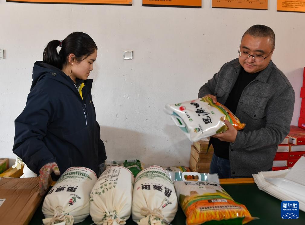 4月17日,在吉林省吉林市永吉县岔路河镇,永吉县鑫丰种植农民专业合作社理事长金天(右)帮助快递员打包大米。