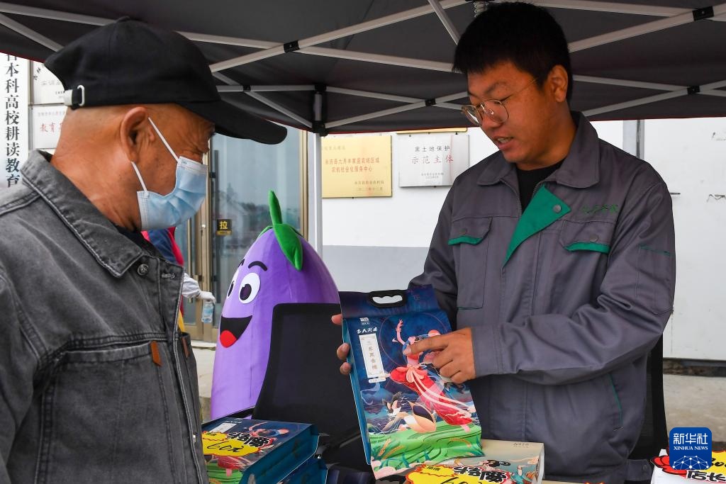 9月20日,在位于吉林省永吉县一拉溪镇的九月丰家庭农场供销大集现场,负责人肖瑶(右)向消费者介绍大米产品。