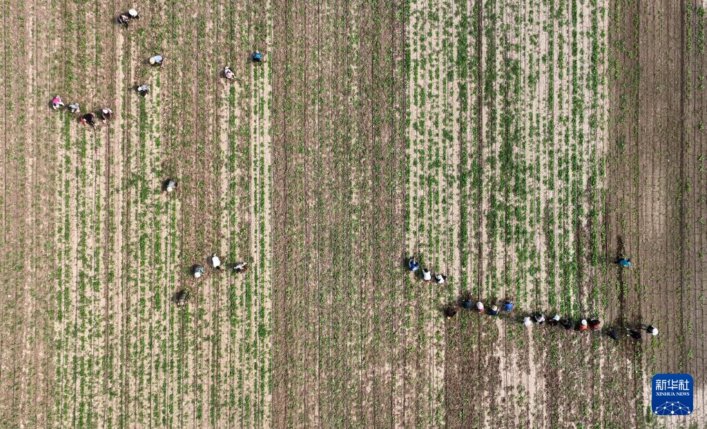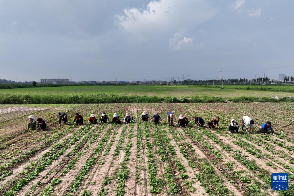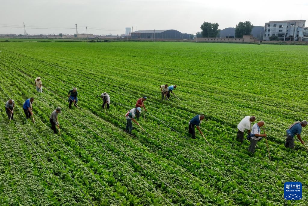 在山西省文水县北张乡北张村,合作社的村民在芥菜地里锄草(8月20日摄,无人机照片)。