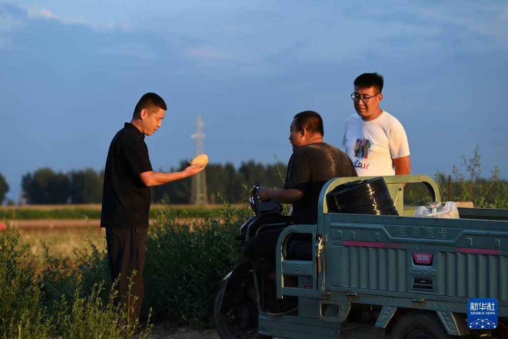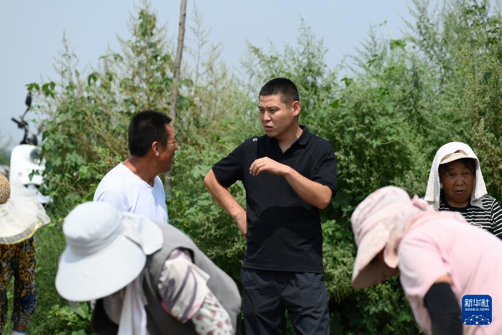 在山西省文水县北张乡,“新农人”赵永壮(中)和村民聊天,了解芥菜的锄草情况(8月20日摄)。