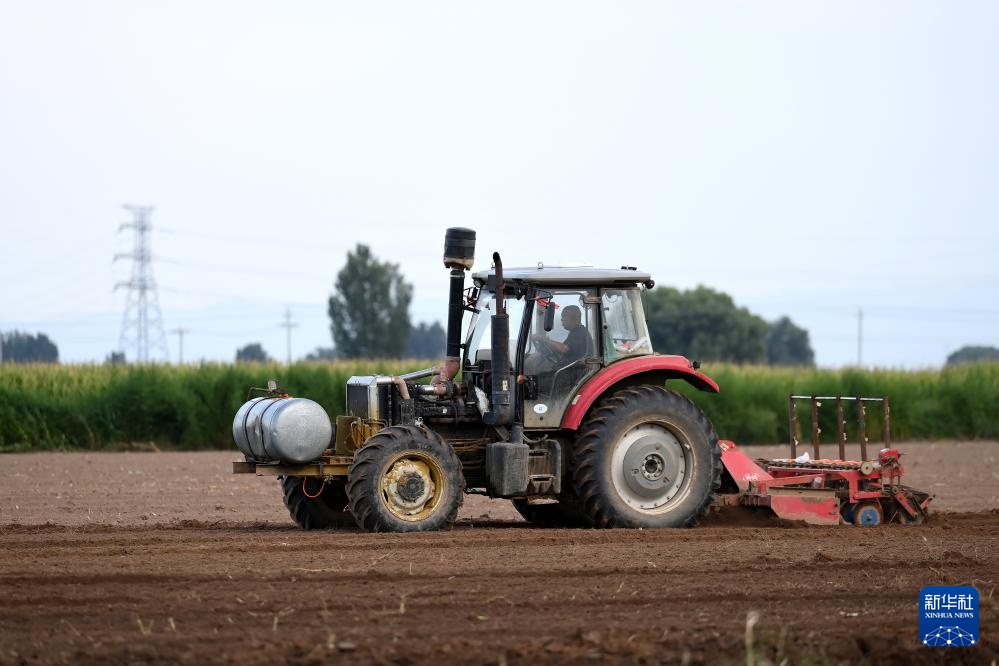 在山西省文水县北张乡,农机手驾驶农机在地里播种芥菜(8月19日摄)。