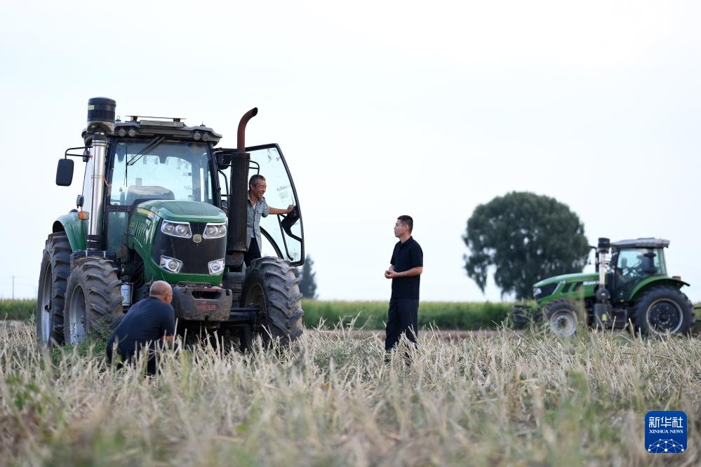 在山西省文水县北张乡北张村,“新农人”赵永壮(右)和农机手聊天,了解犁地情况(8月19日摄)。