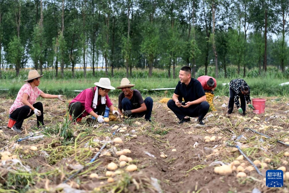 在山西省文水县北张乡南武涝村,赵永壮(右三)向村民了解土豆收获情况(8月8日摄)。