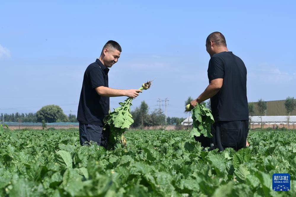 在山西省文水县北张乡北张村,“新农人”赵永壮(左)和村民在查看芥菜的生长情况(9月20日摄)。