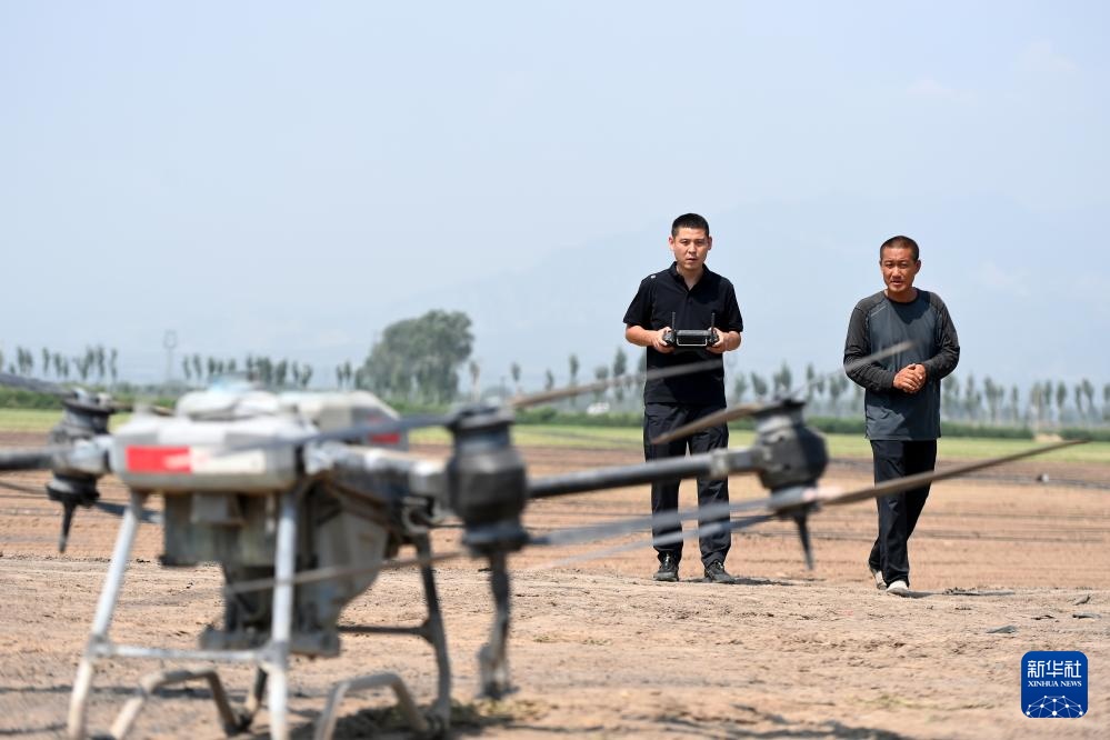在山西省文水县北张乡,“新农人”赵永壮(左)在操作无人机准备喷洒农药(8月20日摄)。