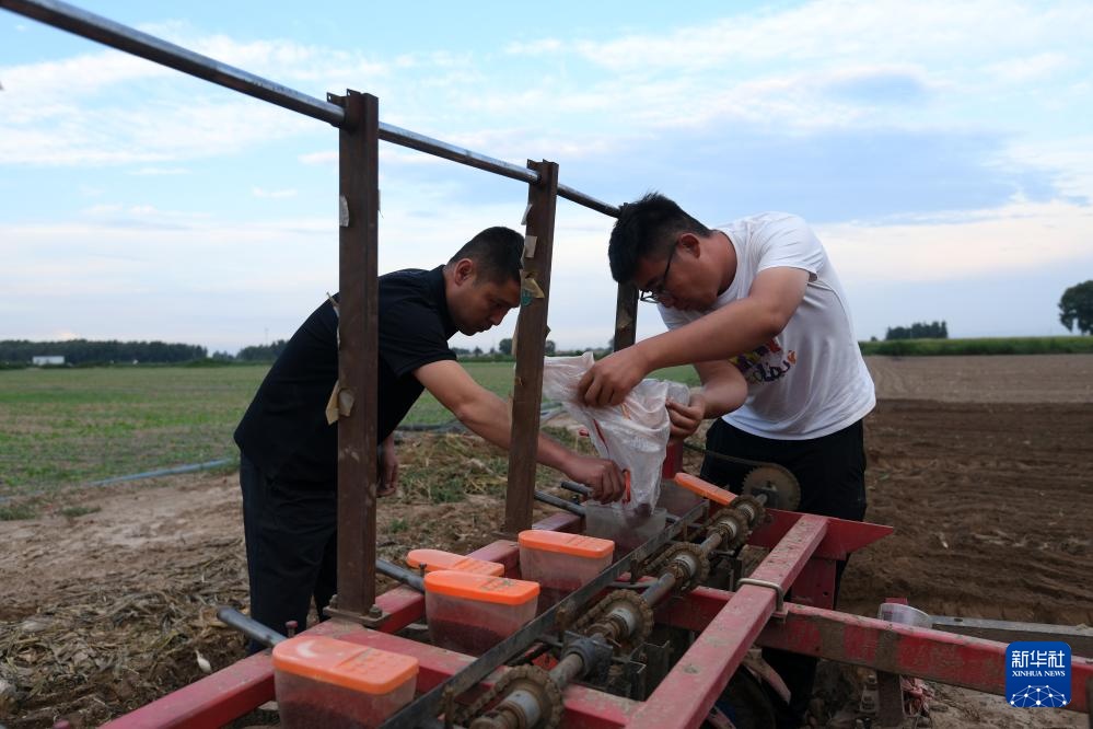 “新农人”赵永壮(左)和村民往播种机里放芥菜种子(8月19日摄)。