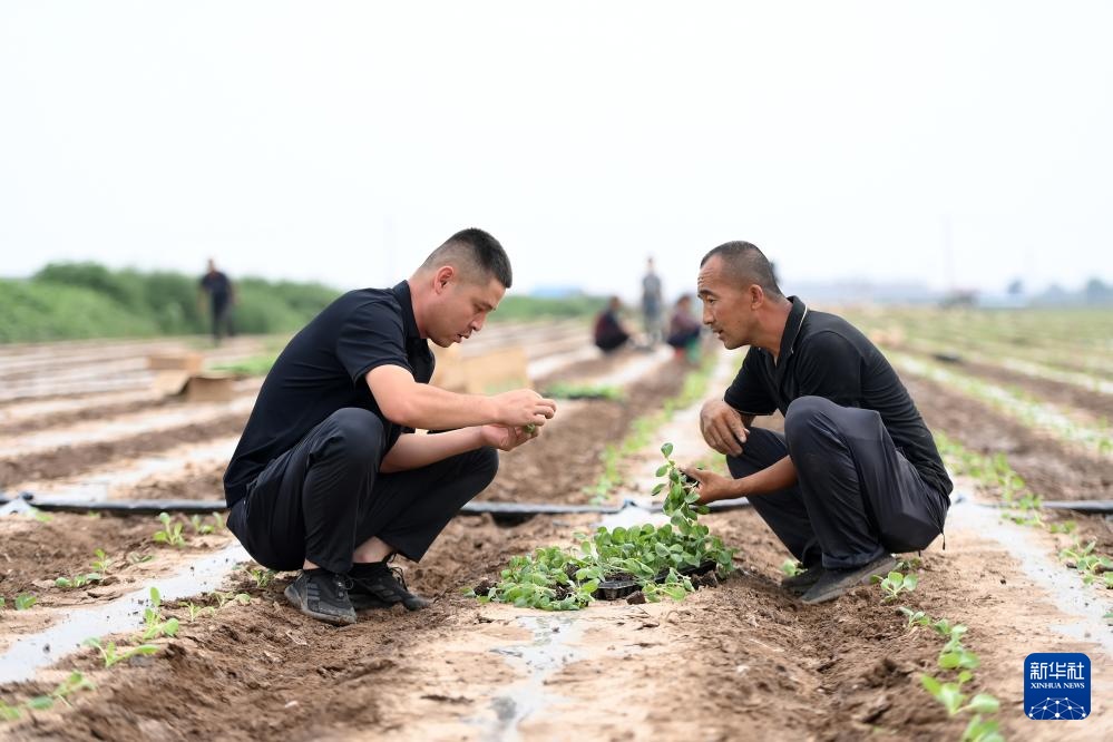 “新农人”赵永壮(左)和村民在查看甘蓝苗的情况(8月8日摄)。