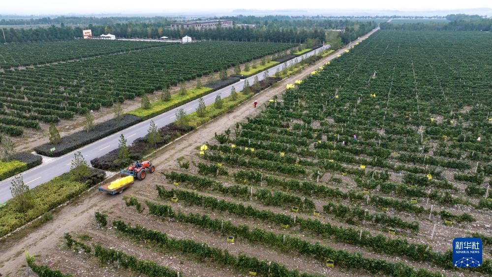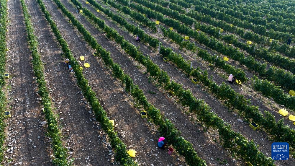 9月19日,工人在宁夏沃尔丰酿酒葡萄种植基地采摘酿酒葡萄(无人机照片)。